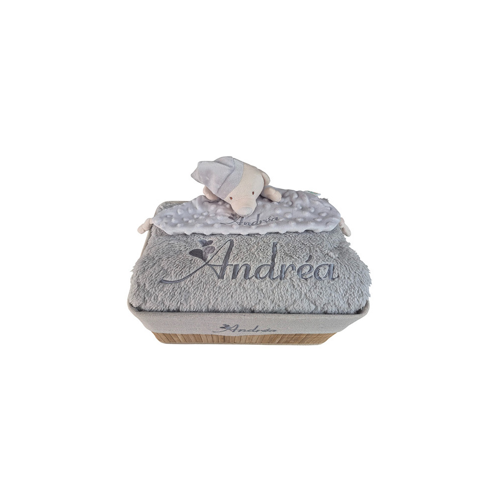 Broderie du prénom de bébé sur la couverture et sur le doudou