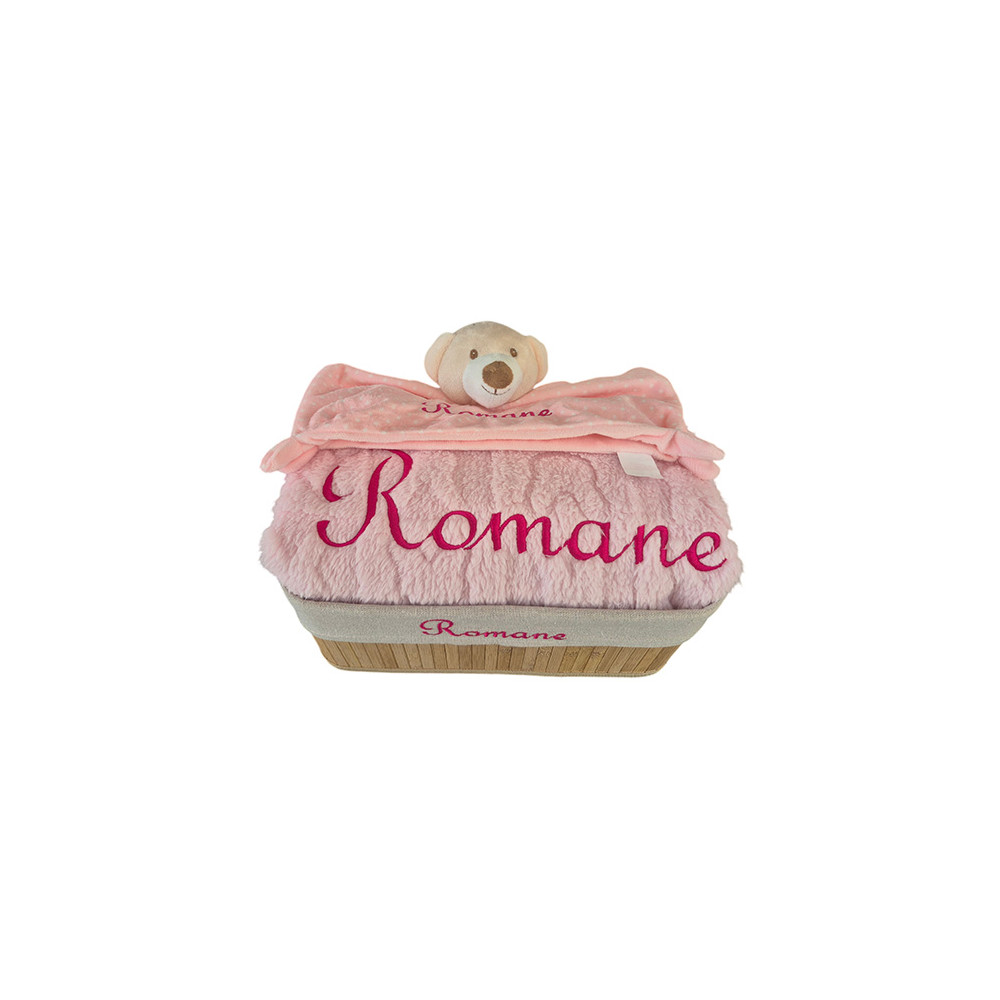 Broderie du prénom de bébé sur la couverture et sur le doudou