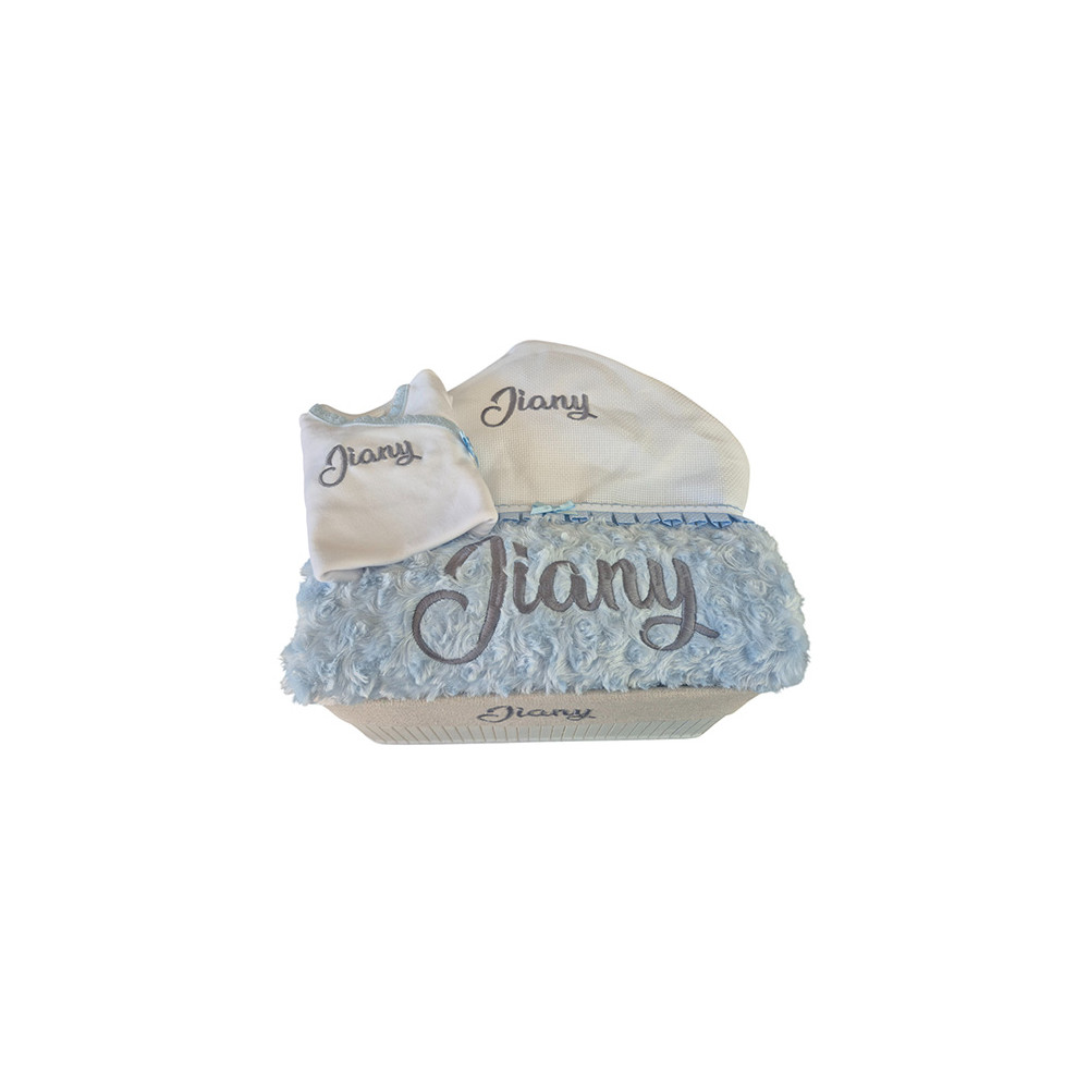 Broderie du prénom sur la sortie de bain, la couverture, et le body