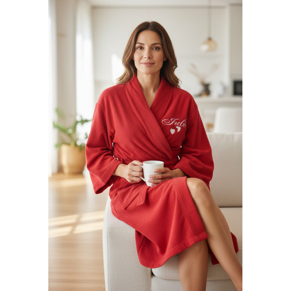 Broderie personnalisée coté cœur ( Prénom, Initiales, Monogramme ou Texte divers) comprise dans le prix du peignoir.