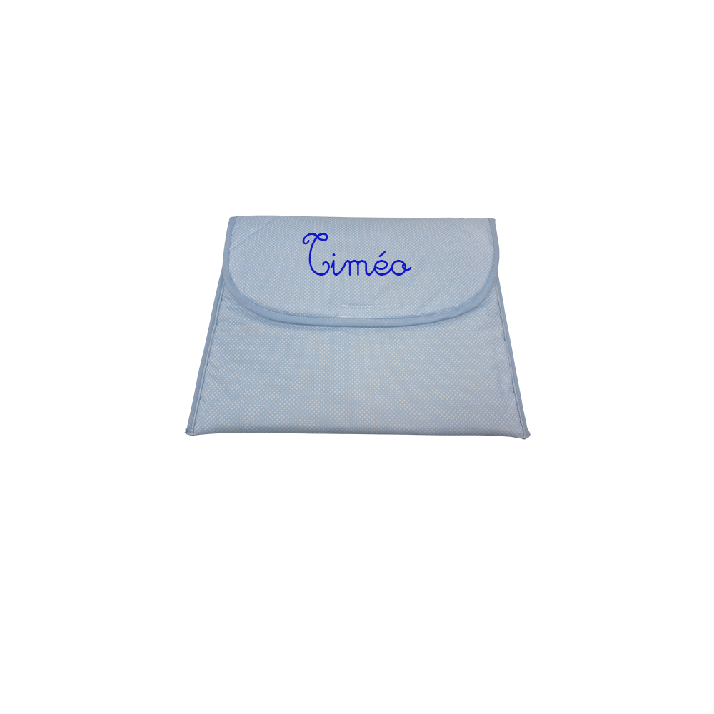 Prénom ou texte de votre choix sur le devant de la trousse, le bavoir, la serviette et le doudou.