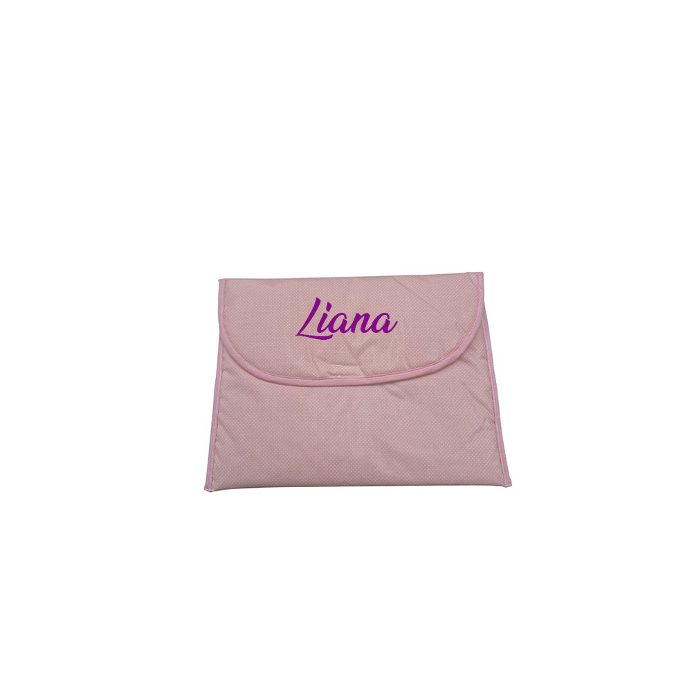 Prénom ou texte de votre choix sur le devant de la trousse, le bavoir, la serviette et le doudou.